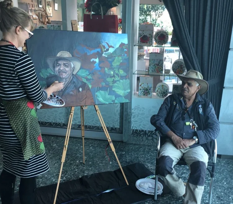 The project started with Den. When chatting about the scared lotus at the gardens I said “I paint Australian natives” and Den said “Paint me”. I did not paint people at that time and was embarrassed by the language faux pas. But then events overtook me and this project was on.